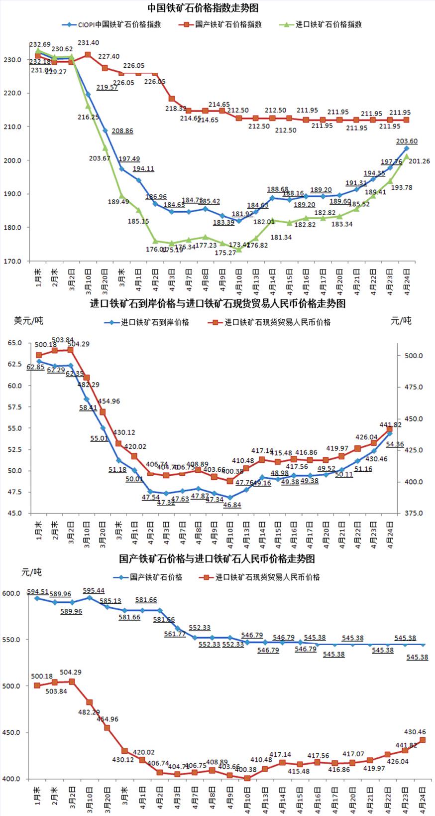 4月24日,中国铁矿石价格指数(CIOPI)203.60点,环比上升5.84点,升幅为2.95%。其中:国产铁矿石价格指数为211.95点,环比持平;进口铁矿石价格指数为201.26点,环比上升7.48点,升幅为3.86%。