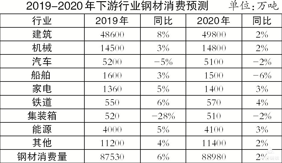 2020年钢铁主要下游行业表现预计会继续分化。其中,基础设施建设投资将加码,房地产行业投资、新开工面积增速可能放缓,家电行业保持平稳增长,汽车、船舶、集装箱和机械行业的部分子行业可能出现负增长。但总体而言,钢材需求量预计整体小幅增长,达到8.9亿吨,同比增长2%。