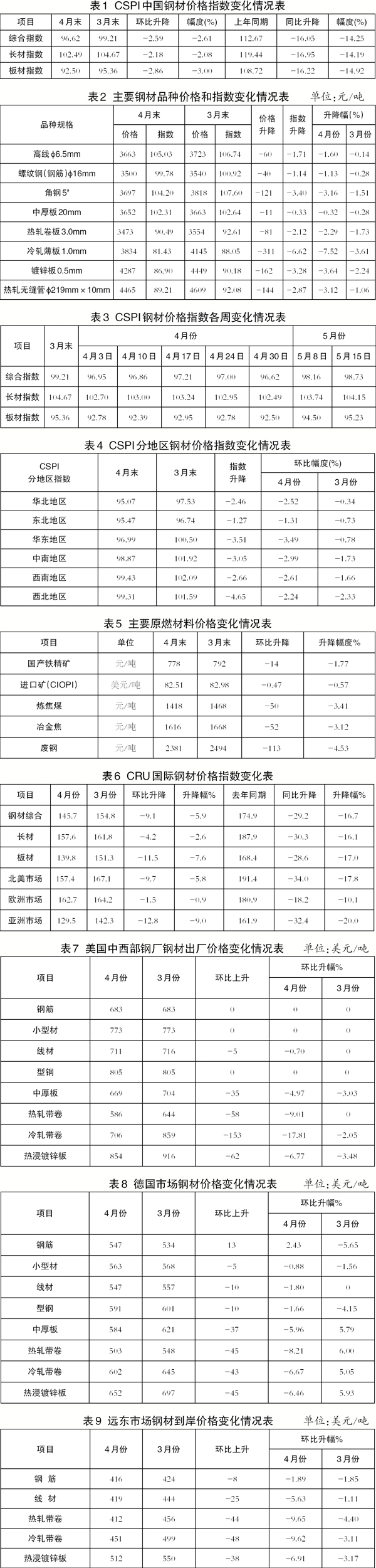 4月末,CSPI长材指数为102.49点,环比下降2.18点,降幅为2.08%;CSPI板材指数为92.50点,环比下降2.86点,降幅为3.00%,比长材指数降幅高0.92个百分点。与去年同期相比,4月末长材指数下降16.95点,降幅为14.19%;板材指数下降16.22点,降幅为14.92%。(见图2、表1)