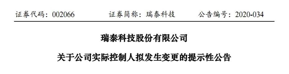 8月27日,瑞泰科技(002066.SZ)发布《关于公司实际控制人拟发生变更的提示性公告》(以下简称“《公告》”)。