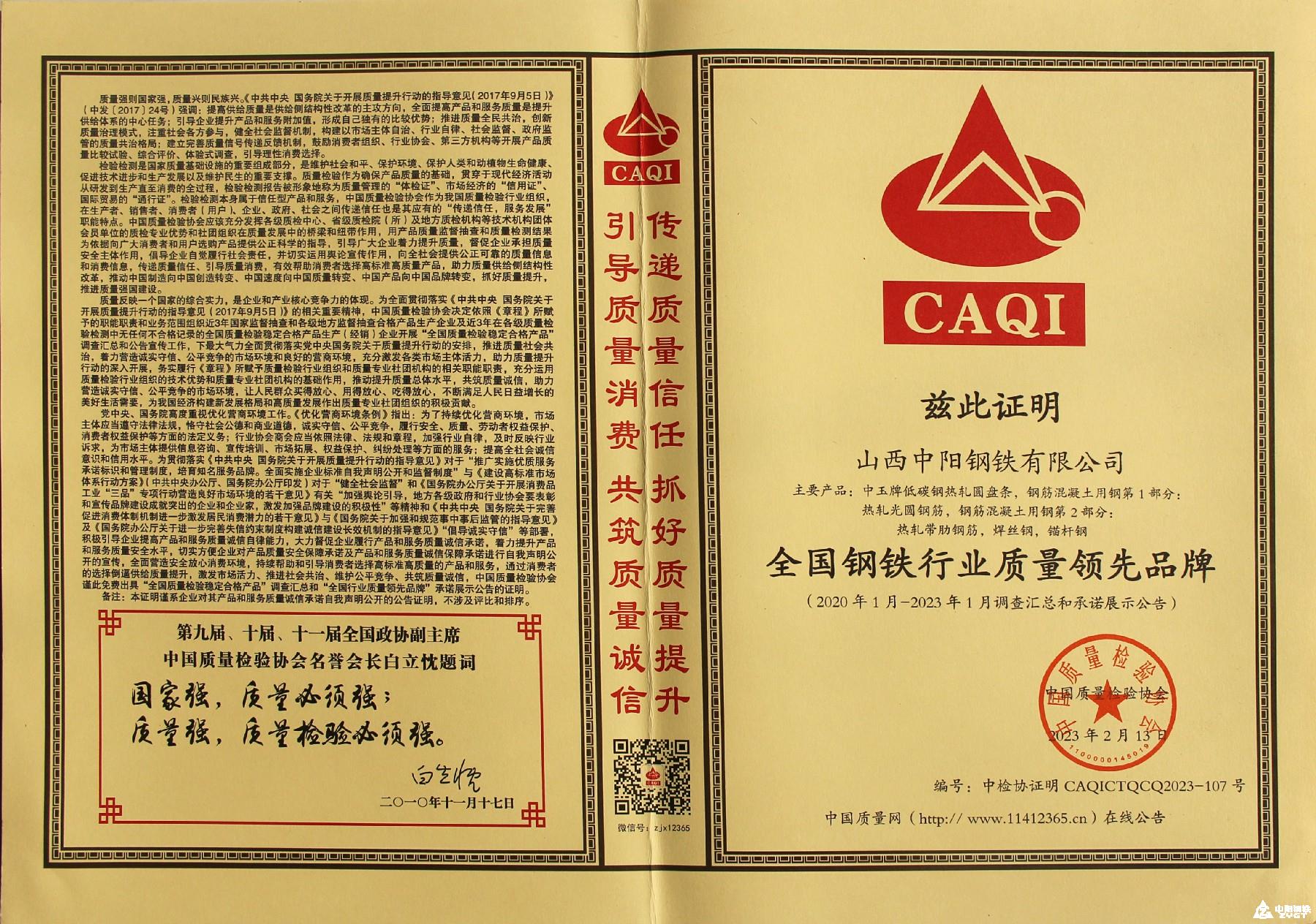 2023年全国钢铁行业质量领先品牌