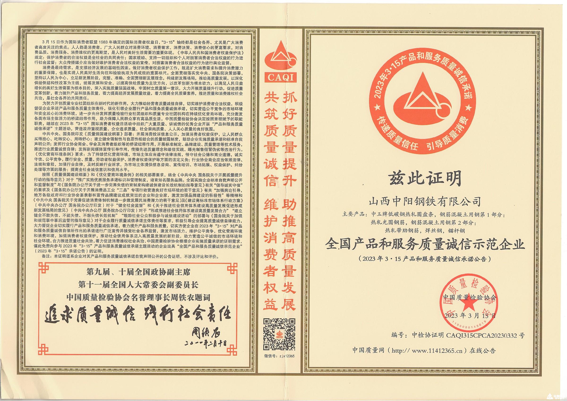 2023年全国产品和服务质量诚信示范企业